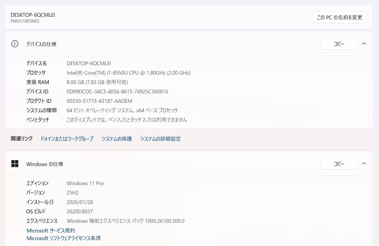 ・OS:Windows11 Pro/25H2(ライセンス認証・Windows update済)