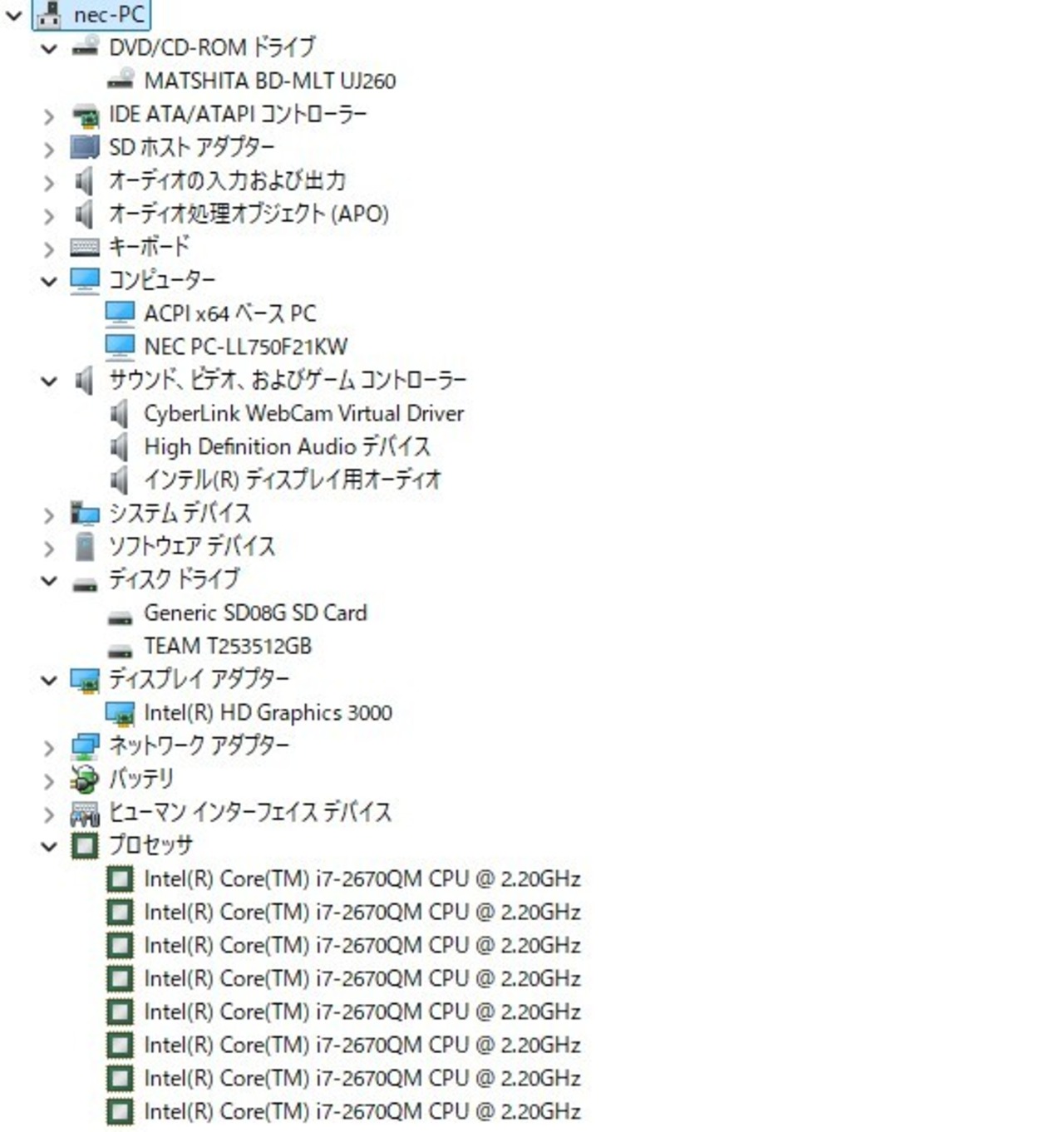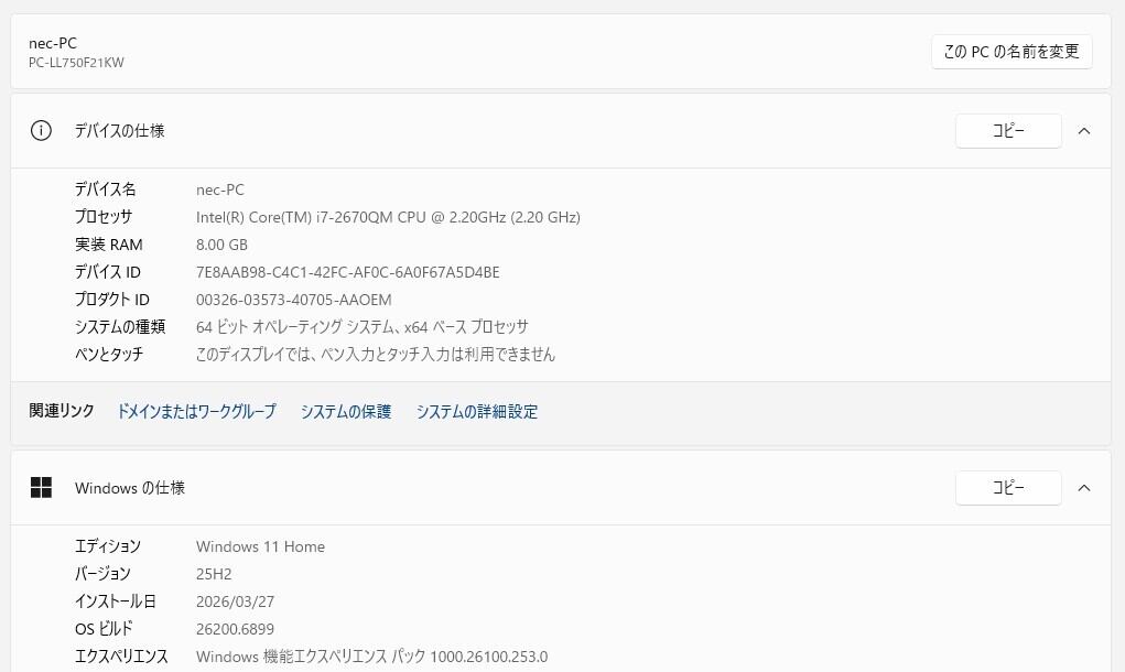 ・CPU:Intel Core i7-2670QM 2.20GHz(2.20GHz)