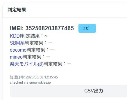 KDDI『○』判定、SIMロック解除有無不明です。