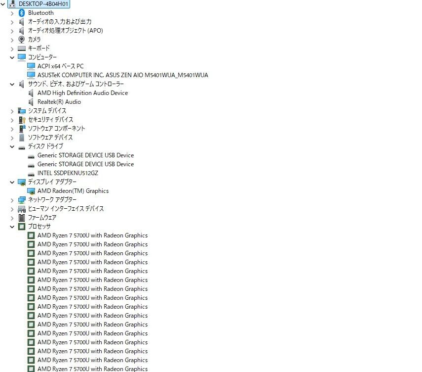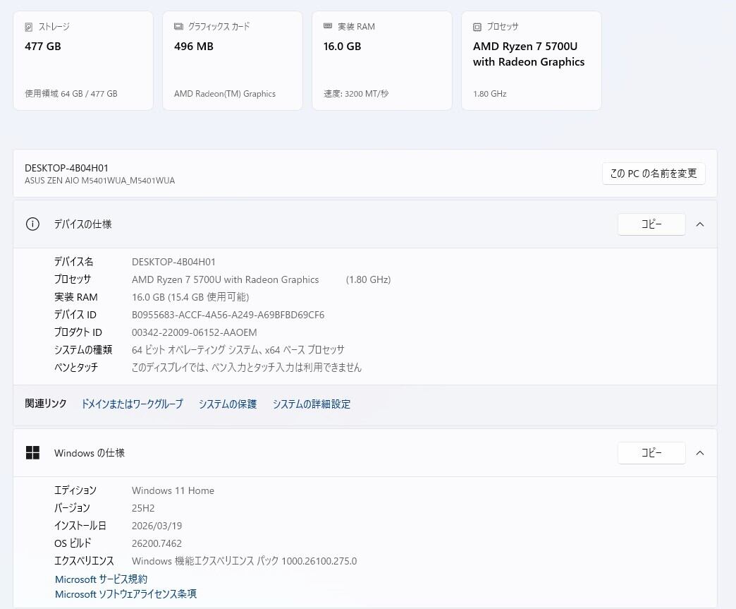 ・CPU:AMD Ryzen 7 5700U (1.80GHz)
