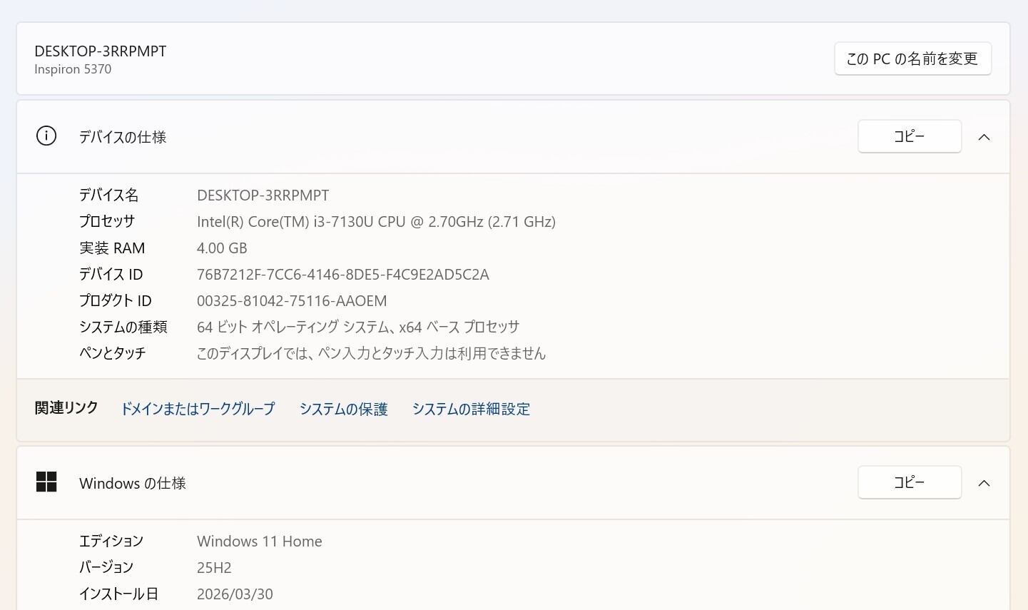 ・CPU:Intel Core i3-7130U 2.70GHz(2.71GHz)