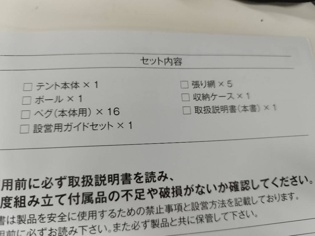 テント、収納袋、ポール、張網×5、ペグ×15、取扱説明書(画像1枚目に写っているもの)