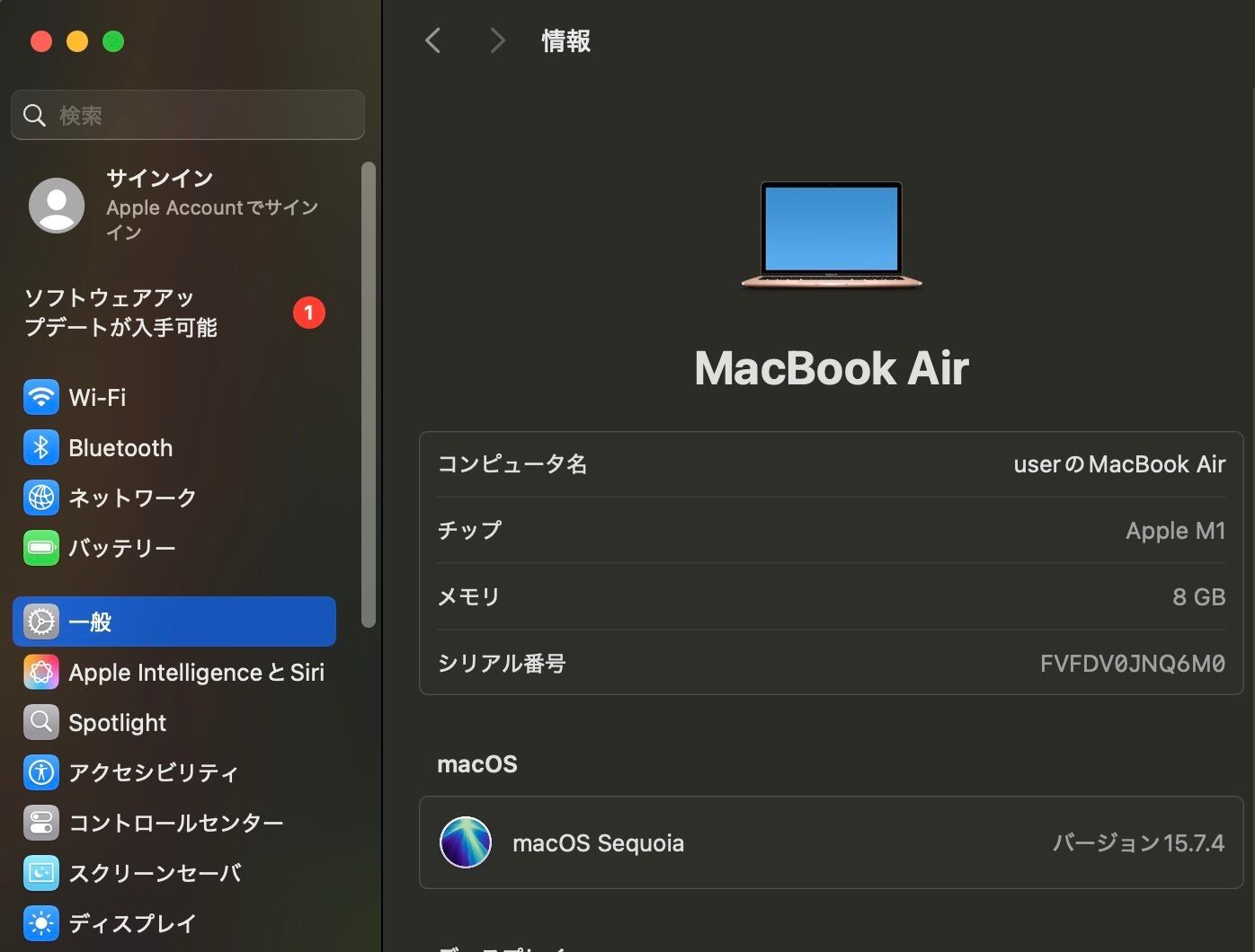 MacBook Air(M1,2020)256GB/8GB〈MGND3J/A〉⑤