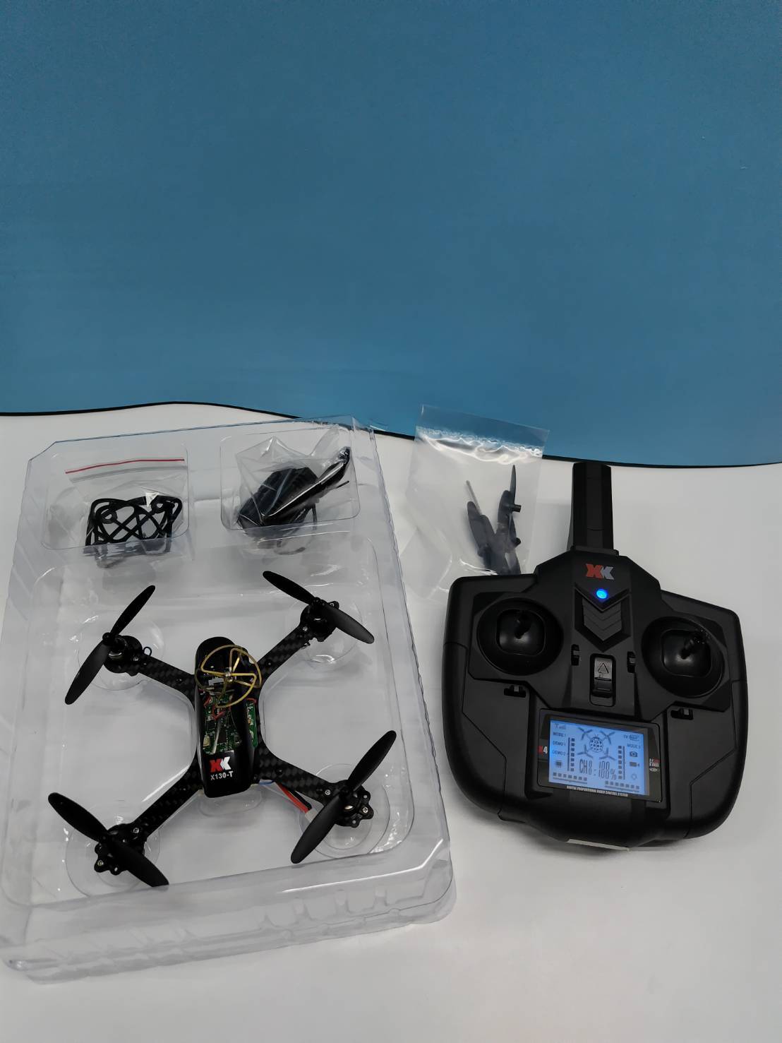 内容物:機体、送信機、バッテリー、スペアローターブレード、