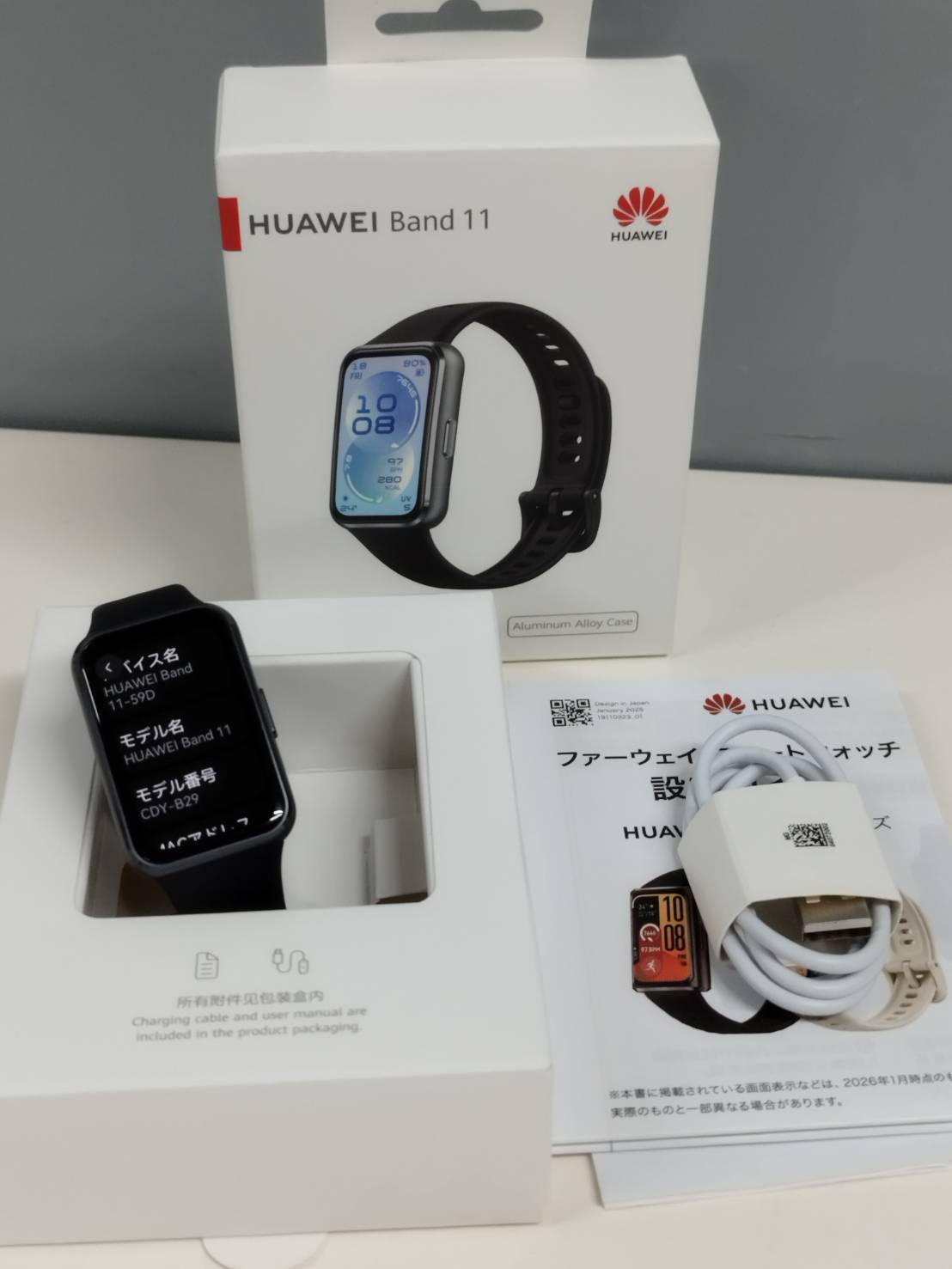 本体、バンド、充電ケーブル、設定ガイド等印刷物(画像1枚目に写っているもの)