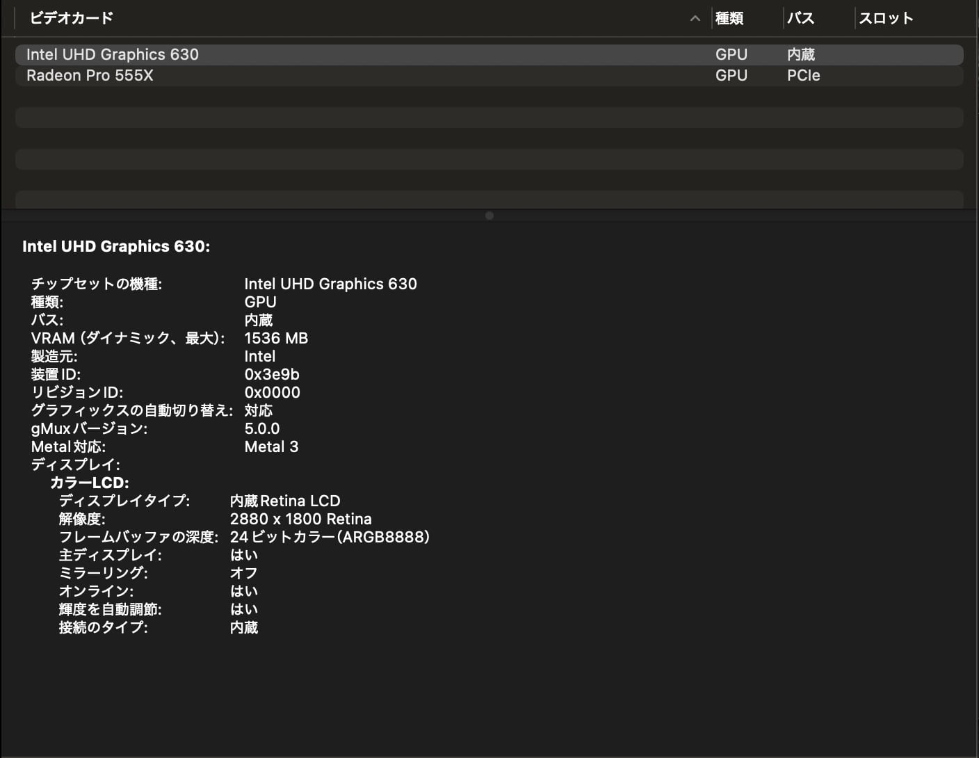 ・ディスプレイ:Retina 15.4インチ(2,880 x 1,800)