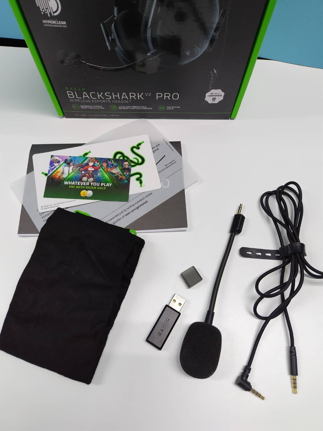 内容物:ヘッドホン、マイク、USBレシーバー、ケーブル、印刷物、ポーチ(画像1枚目に写っているもの)