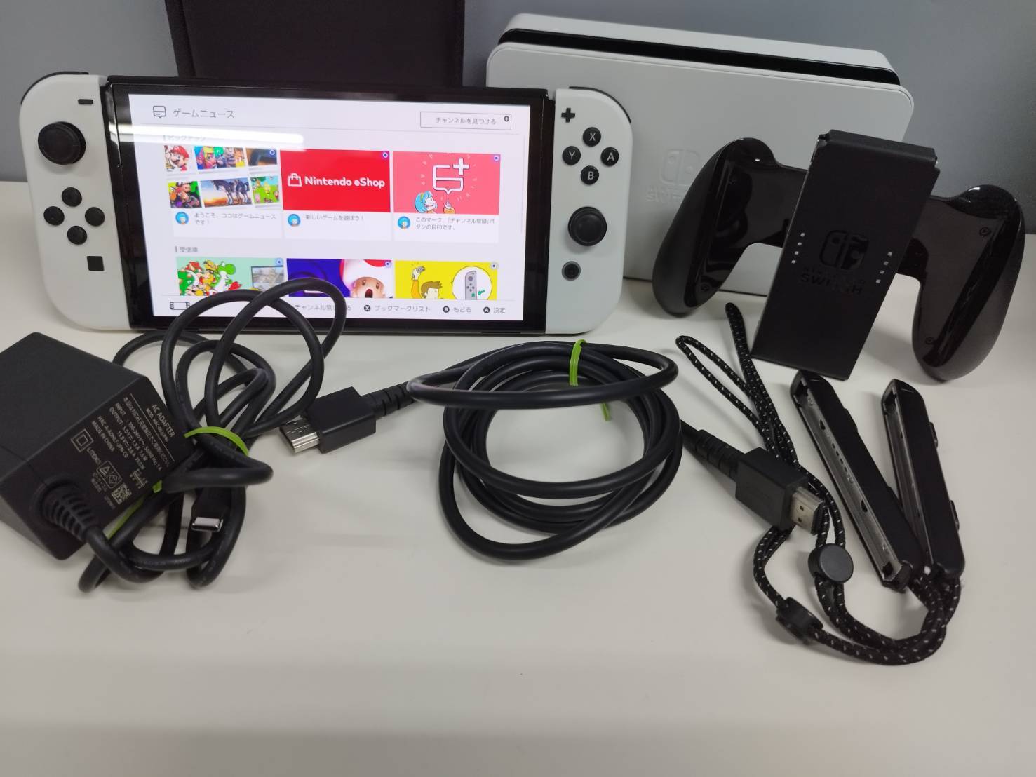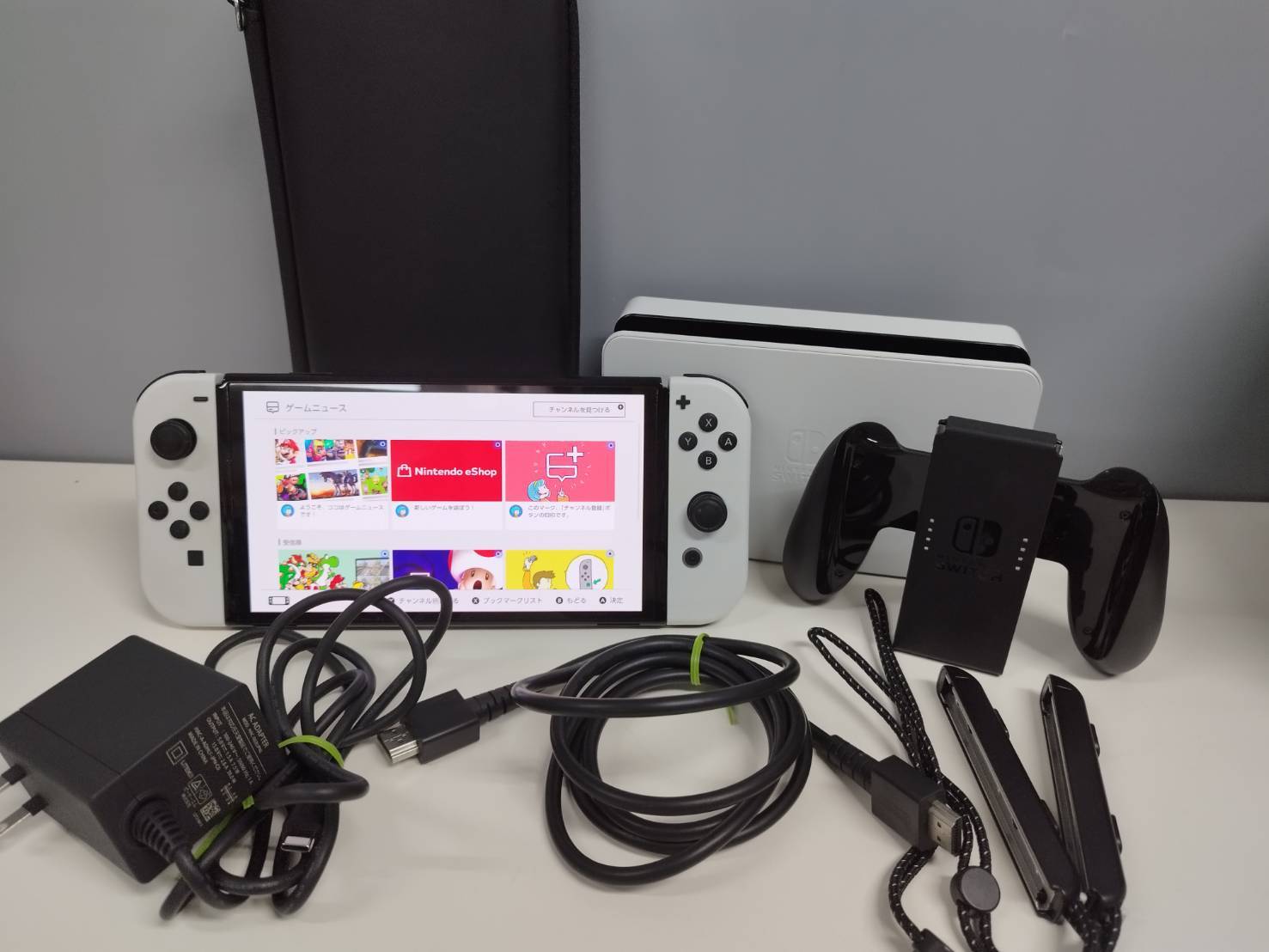 本体、Joy-Con、ドック、グリップ、ストラップ、HDMIケーブル、ACアダプター、キャリングケース(画像1枚目に写っているもの)