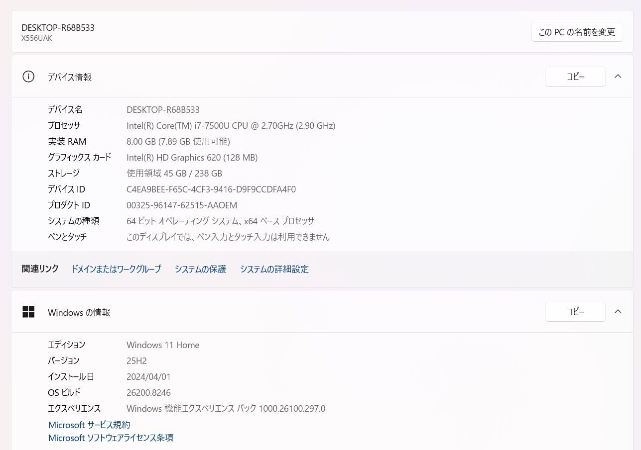・OS:Windows11 Home/25H2(ライセンス認証・Windows update済)