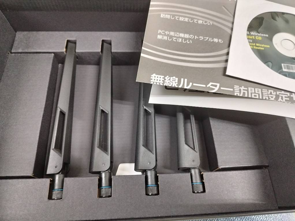 本体、アンテナ、ACアダプター、LANケーブル、サポートCD、保証書等印刷物(画像1枚目に写っているもの)