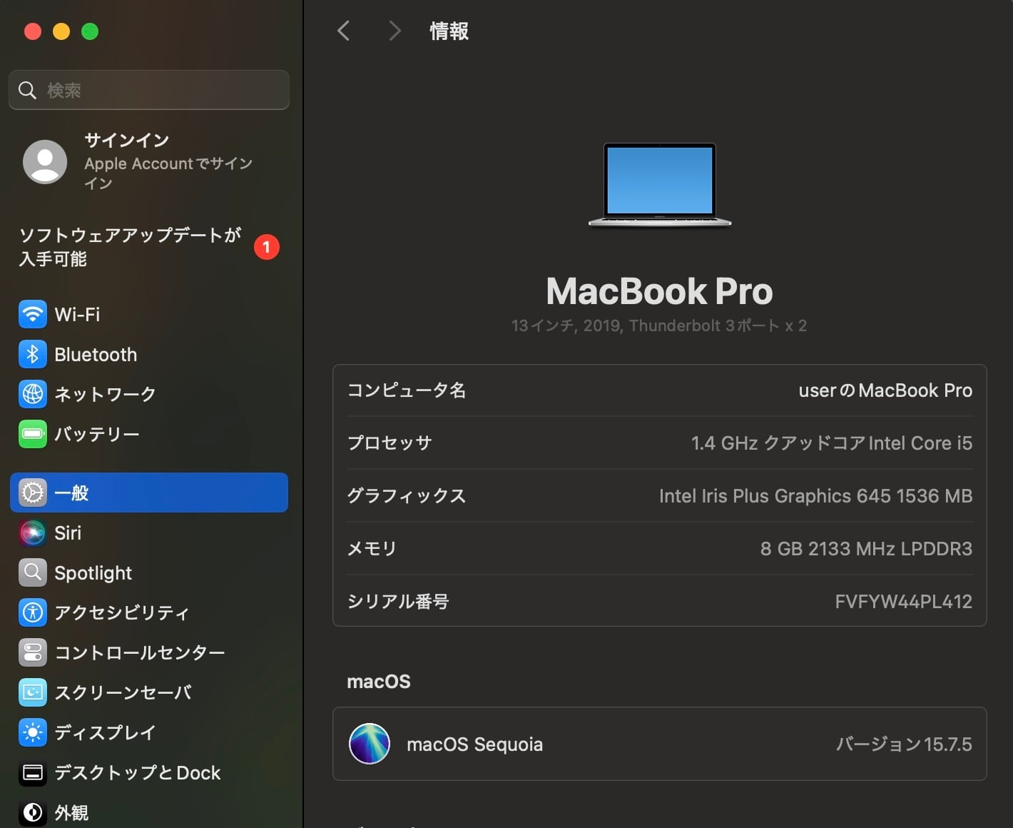 MacBook Pro(13インチ,2019,Thunderbolt 3ポートx 2)256GB/8GB〈MUHR2J/A〉⑤