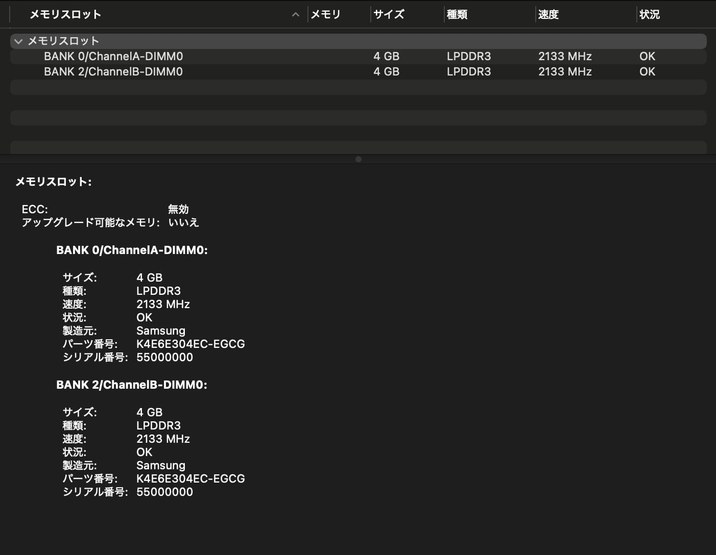 ・メモリ:8GB(4GB x 2)