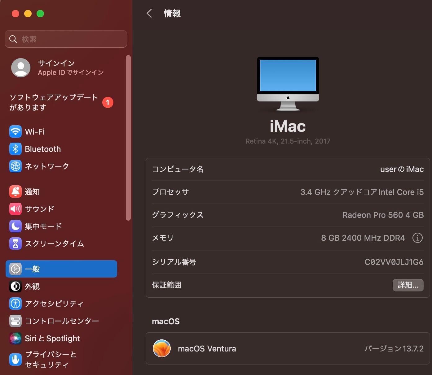 ・ディスプレイ:21.5インチ Retina 4Kディスプレイ(4,096 x 2,304)